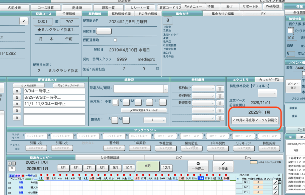 対象となる年月のカレンダーを選択して この月の停止等マークを初期化 ボタンを押します。