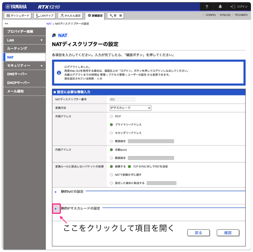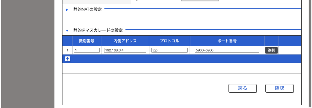 詳細設定>NAT>>静的IPマスカレードの設定