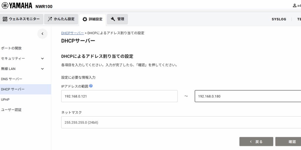 詳細設定>DHCPサーバー>DHCPによるアドレスの割り当ての設定