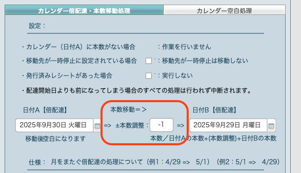 メニュー:業務メニュー>特別作業>カレンダー倍配達・空白処理